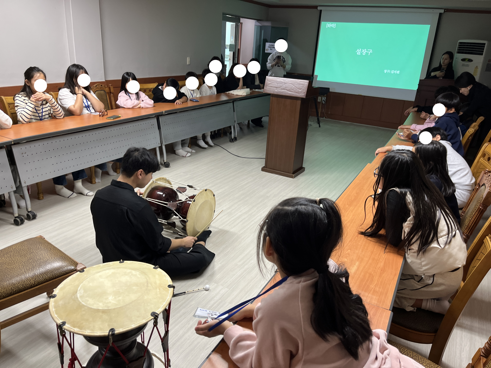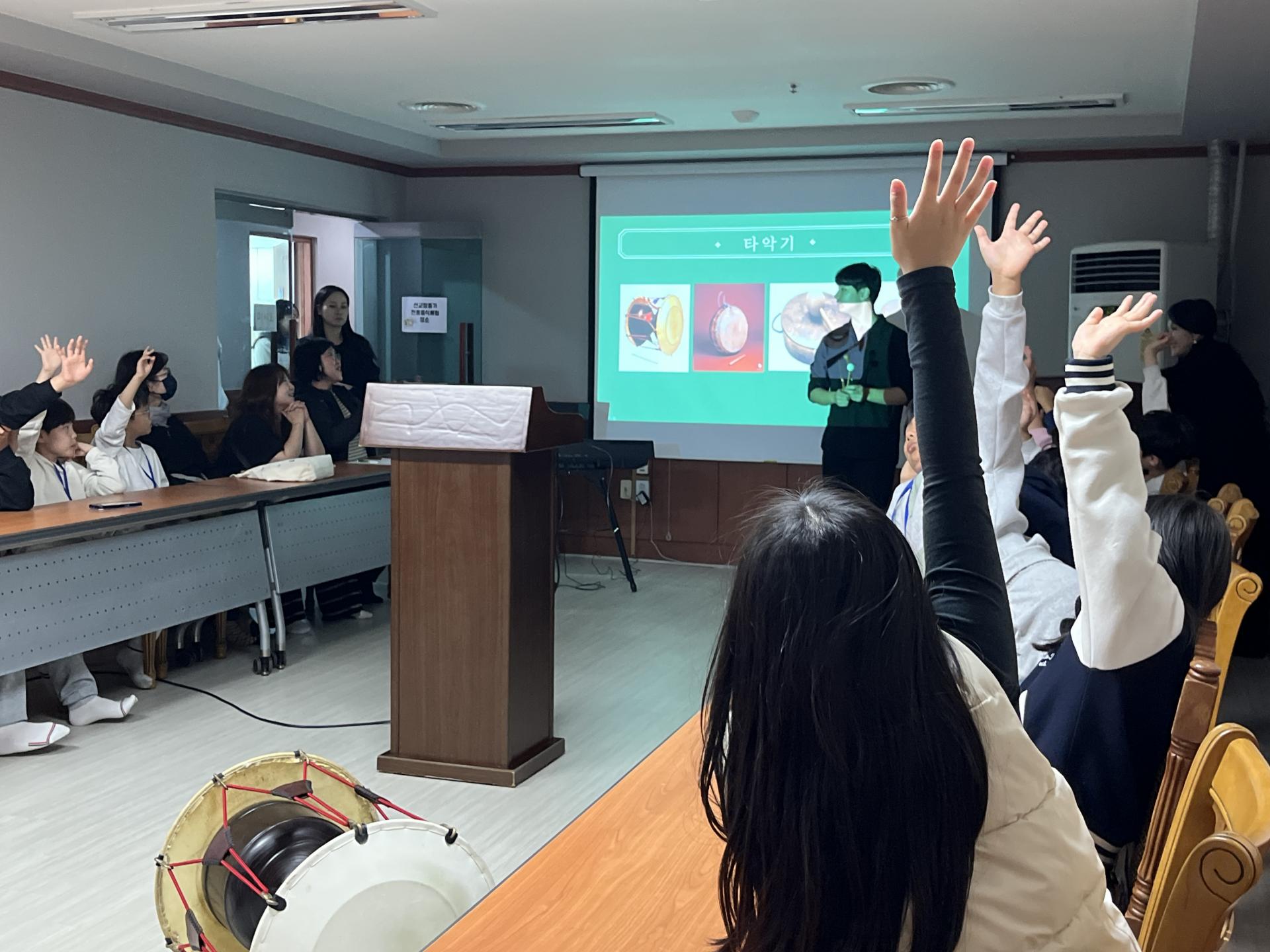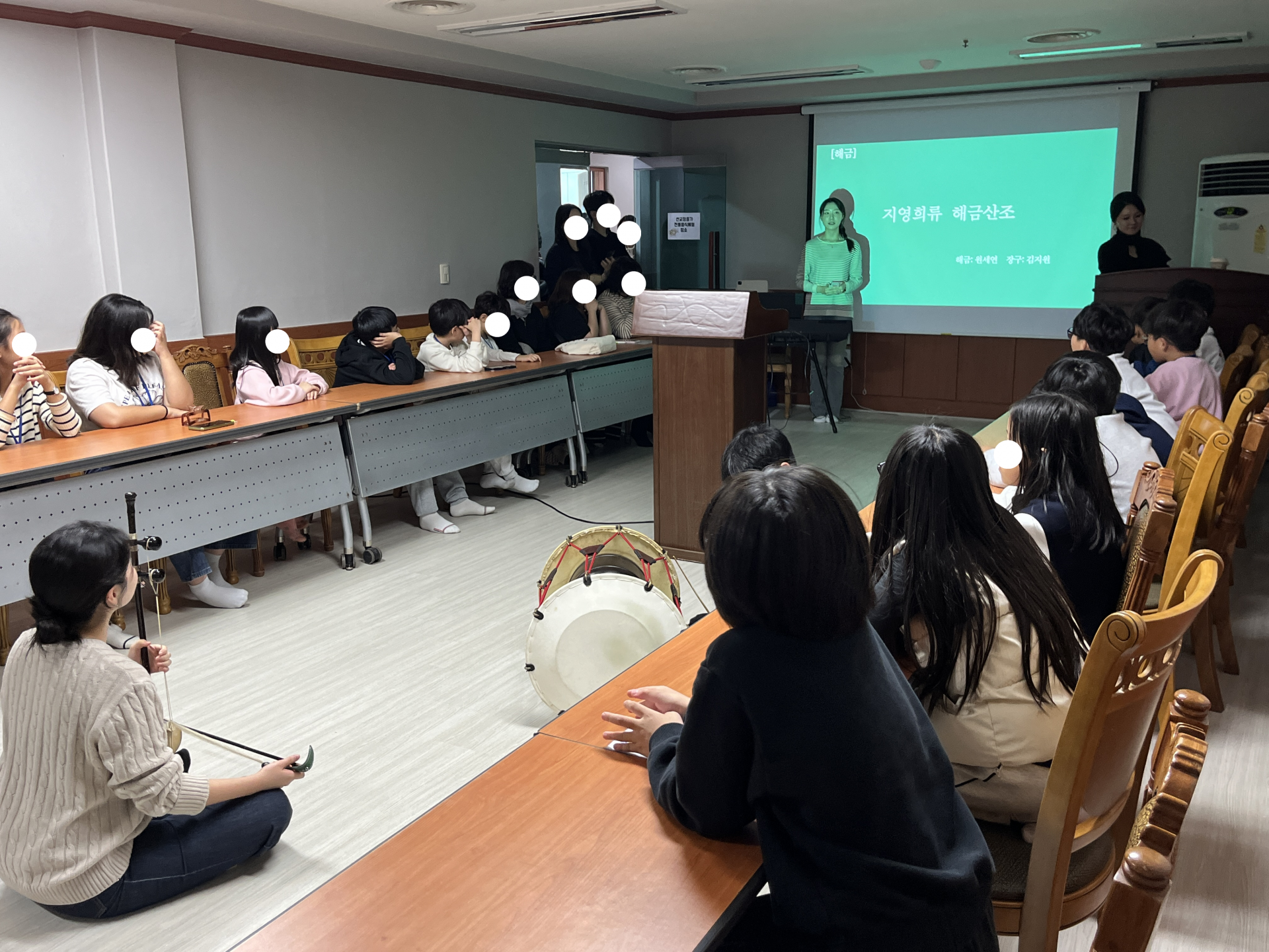 서울대 국악과 '사회공헌단' 팀에서 직접 가야금, 해금, 타악기 등 다양한 전통악기를 가지고 와서 악기의 특징을 소개하고 직접 연주해보는 시간을 가졌습니다.